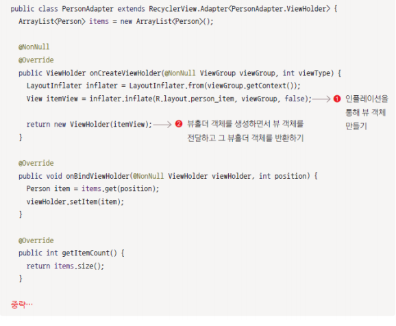 화면에 모든 Person 객체가 보이지 않을 수 있다. 이 메서드를 통해 안보이는 person 객체가 보여지게 때 기존의 ViewHolder를 재활용해 내용만 바꿔 설정한다.