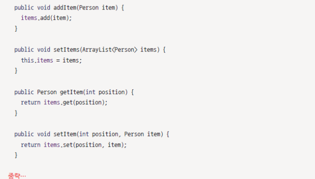 위에서 만든 person 객체들의 집합들인 리스트를 화면에 보여주기 위해 어댑터를 만든다.