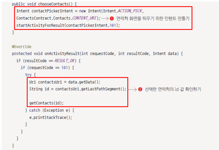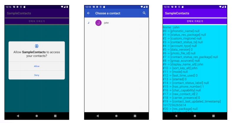 연락처 가져오기 버튼을 누르면 연락처 화면이 나타나고 선택한 연락처를 보여주자.