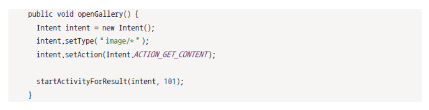 버튼을 누를 시 인텐트를 이용해 갤러리 화면을 띄운다.