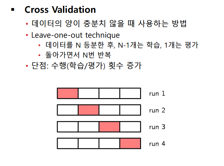 충분하지 않은 데이터를 잘 조작해서 성능을 최대한 끌어올려야 하는데, 이 때 Cross Validation (CV) 방법을 사용한다.