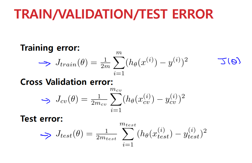 각 덩어리에 대한 Training error / CV error / Test error 이다.