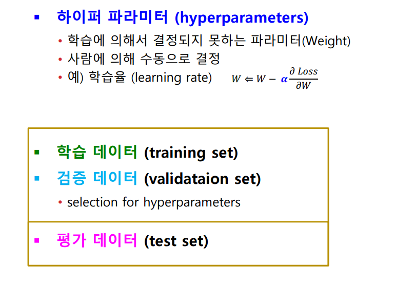 즉, 학습에 의해서 결정되지 못하는 Parameter를 하이퍼 파라미터라고 한다.