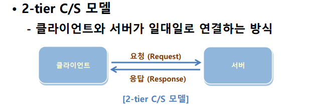 클라이언트는 서버에 데이터를 요청하고 서버는 그 요청에 대해 응답하는 형식의 2-tier 모델이 있다. 이 경우에 서버가 직접 데이터베이스를 다루고 만약 데이터베이스를 다루는 방식에 변화가 있으면 클라이언트에도 문제가 생긴다.