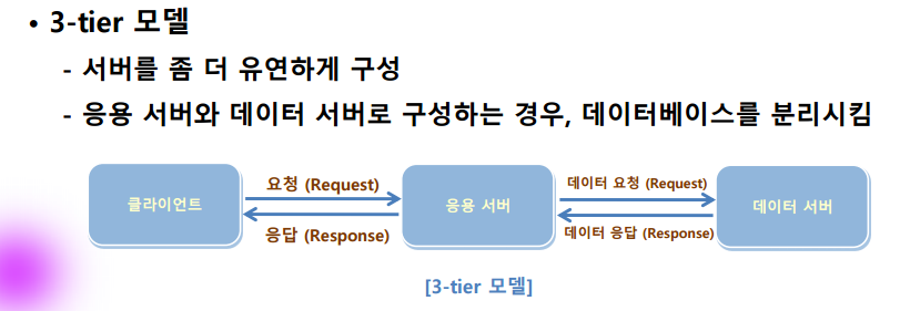 이 문제를 해결하기 위해 3-tier 모델이 도입됐다. 클라이언트와 서버가 소통하는 점에서는 2-tier 모델과 같지만, 서버를 응용 서버와 데이터 서버로 분리해 데이터를 관리하는 서버를 따로 구성하는 부분에서 차이가 있다. 이 외에도 서버를 두지 않고 단말끼리 서버와 클라이언트 역할을 하는 P2P모델도 있는데, 자세한 내용은 데이터베이스를 공부할 때 다루기로 하고 지금은 이 정도만 공부하자.