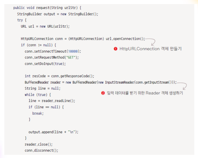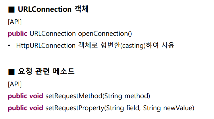url 객체를 만들고 형변환을 통해 url을 HttpURLConnection 형태로 받아온 후 받아온 conn 변수 통해서 HttpURLConnection 클래스의 메서드를 사용해서 요청을 처리한다.