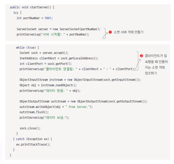 서버와 클라이언트가 있을 때 클라이언트는 서버에 접근하기 위해 소켓이라는 개체를 만든다. 그리고 서버는 서버 소켓을 만들어 클라이언트와 연결한다. 이 두 소켓이 연결되고 통로가 생기면 Stream 객체를 사용해서 데이터를 보내거나 받을 수 있다. (자바의 입출력 파트 write 를 사용해서 서버가 클라이언트에게 데이터를 전달한다.)