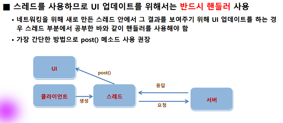 쓰레드는 핸들러 없이 UI를 변경할 수 없다. 위의 작업 순서도와 같이 핸들러를 생성하고 핸들러의 post()메서드를 이용해 UI에 접근한다. (UI 업데이트를 위해 핸들러를 사용)