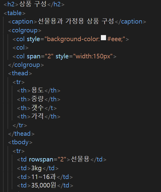th 태그로 용도 중량 갯수 가격 을 지정했다. th 태그를 사용하면 자동으로 굵게 표시된다.