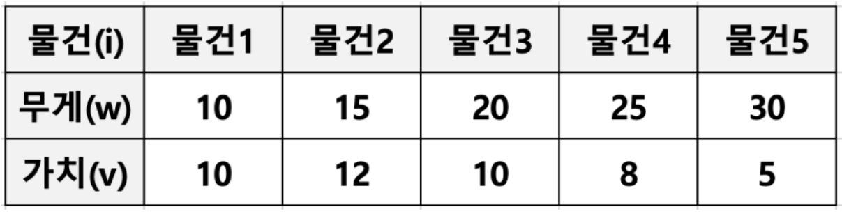 무게 제한이 있는 상황에서, 최대 가치를 담을 수 있도록 배낭에 물건을 넣어야 한다.