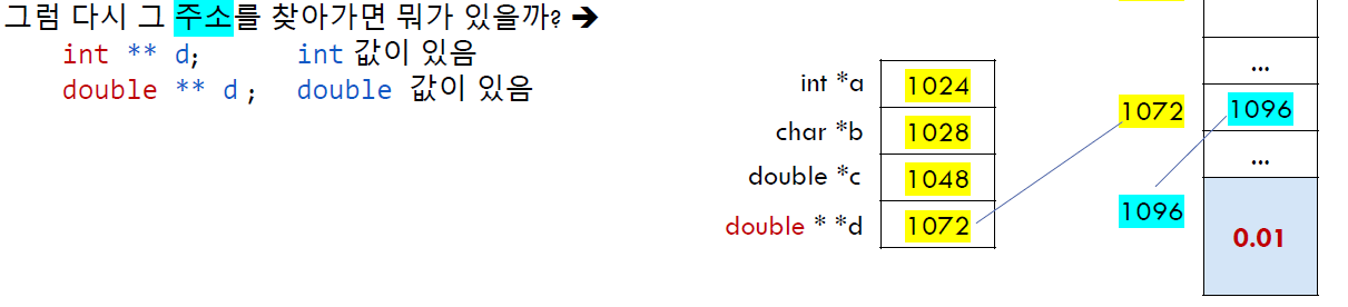 변수 d 는 * 타입. 즉, 주소 타입이고, 그 주소를 찾아가면 또 다시 주소가 나오고, 그 주소를 찾아가면 int값이 나온다.. 정도로 생각할 수 있다.