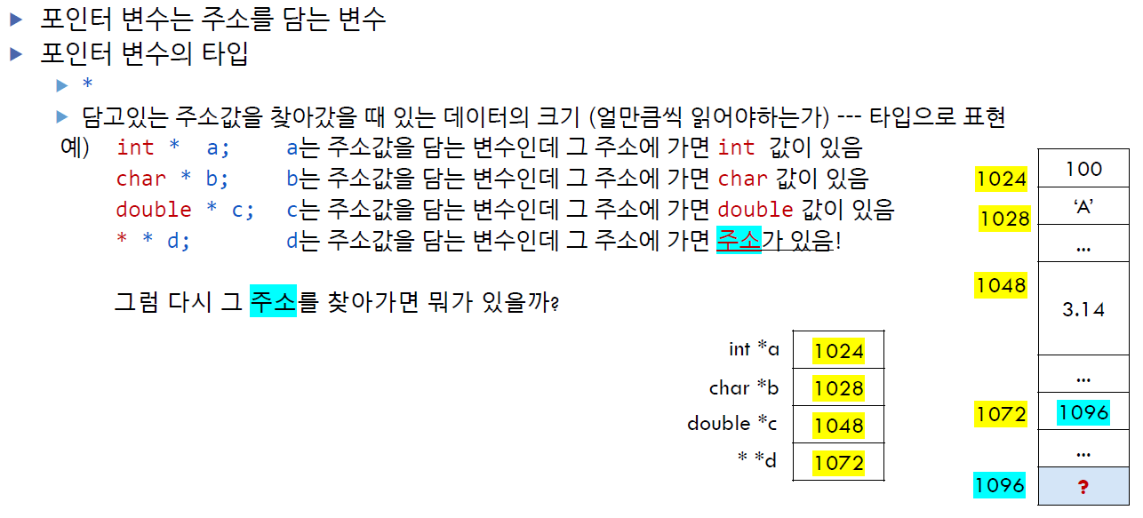 포인터 변수는 어떤 값의 주소를 담는 변수이다.
