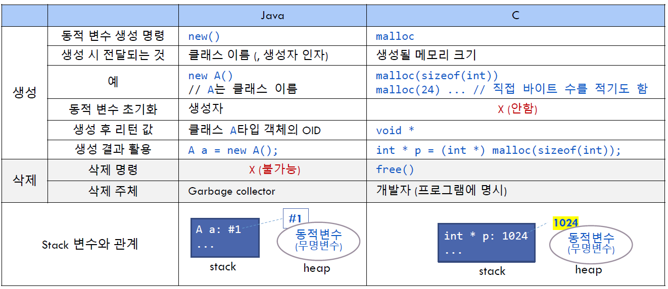 자바에서는 new연산자를 호출할 때 클래스 이름과 생성자의 인자를 통해 컴파일러가 클래스를 찾아 운영체제에게 메모리를 할당받고, C에서는 바이트 수를 통해 메모리를 할당받는다.