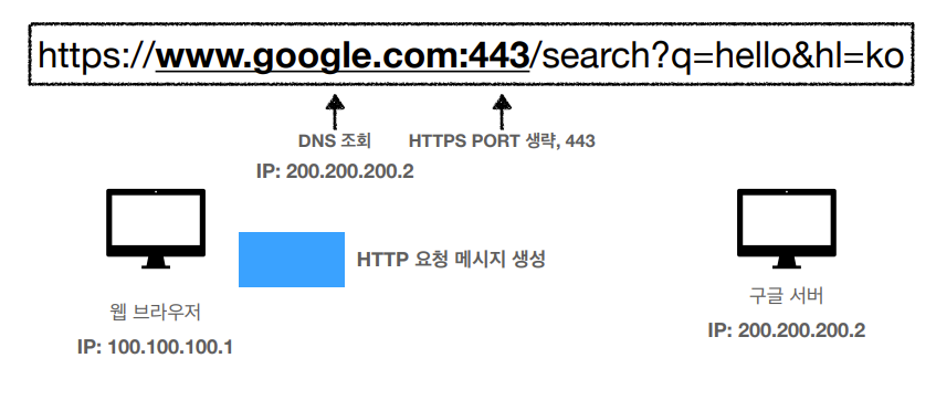 웹 브라우저는 해당 DNS를 통해 IP주소와 포트번호를 찾고 HTTP 요청 메세지를 만든다.