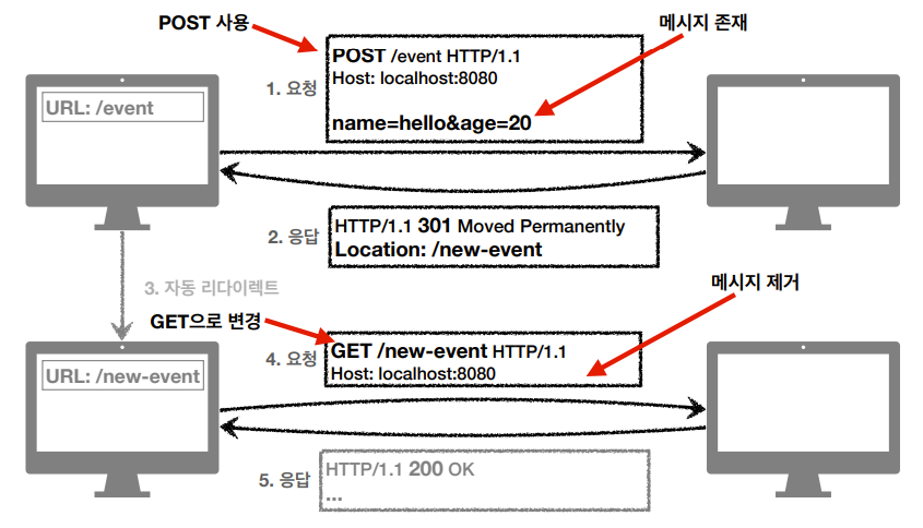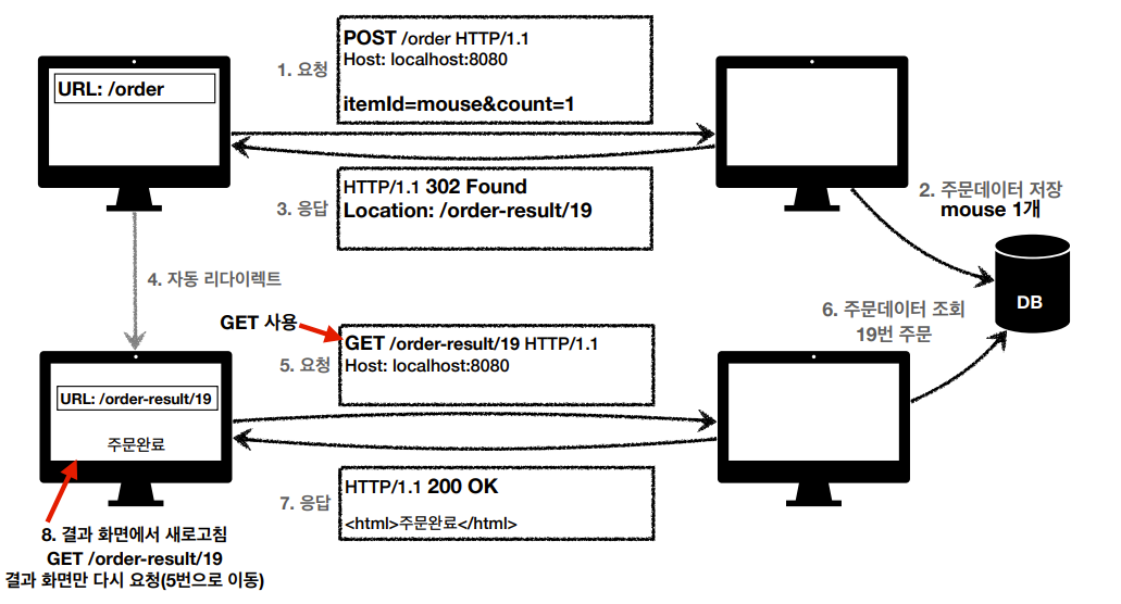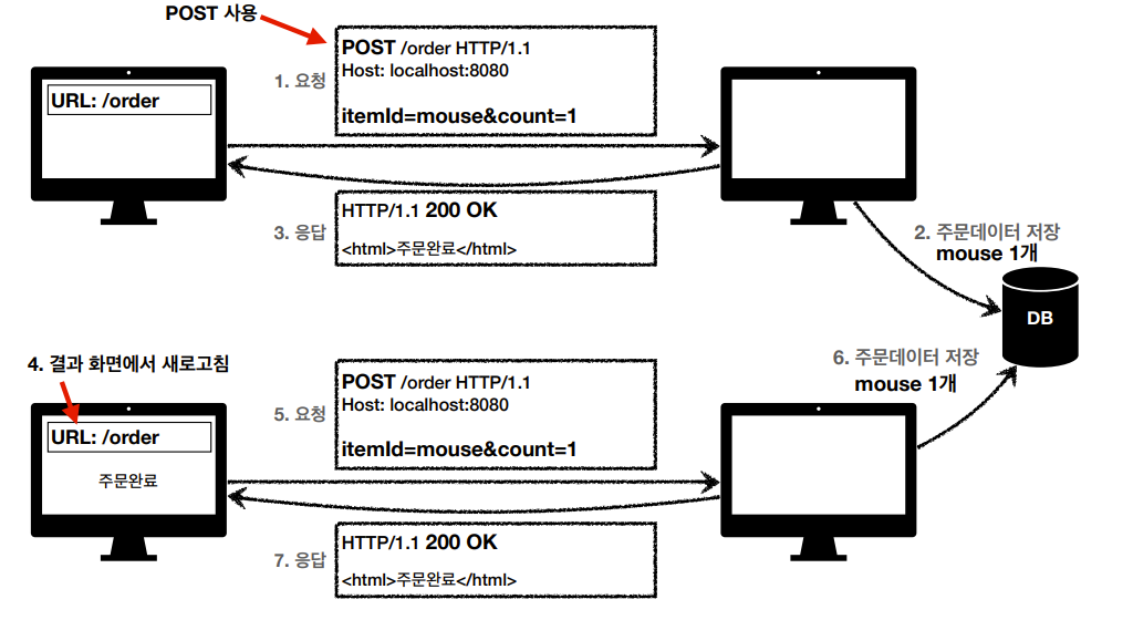 쇼핑몰에서 POST 메서드로 주문을 넣었다고 하자. 주문을 넣은 결과 화면에서 새로고침하면 해당 URL으로 주문이 또 들어가게 돼 중복 주문이 발생한다.