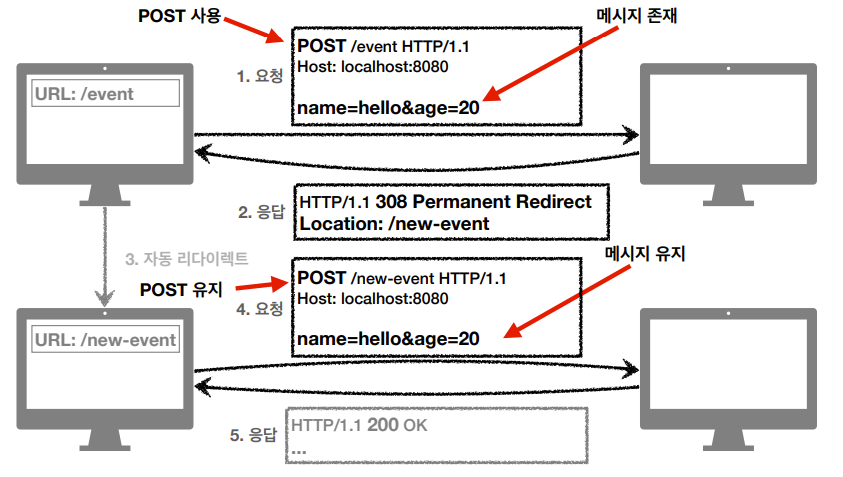 301은 리다이렉트 시 요청 메세지가 GET으로 바뀌며 본문이 제거될 수 있고, 308은 요청 메서드를 유지한다.