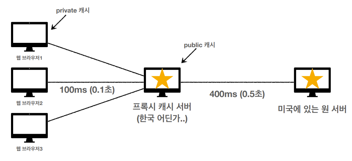 처음 요청을 보내는 클라이언트는 프록시 캐시 서버에 캐시가 없어 느리지만, 그 이후의 클라이언트들은 프록시 캐시 서버에 있는 캐시를 사용해 미국에 있는 origin 서버까지 요청할 필요가 없어 빠르게 응답받는다.