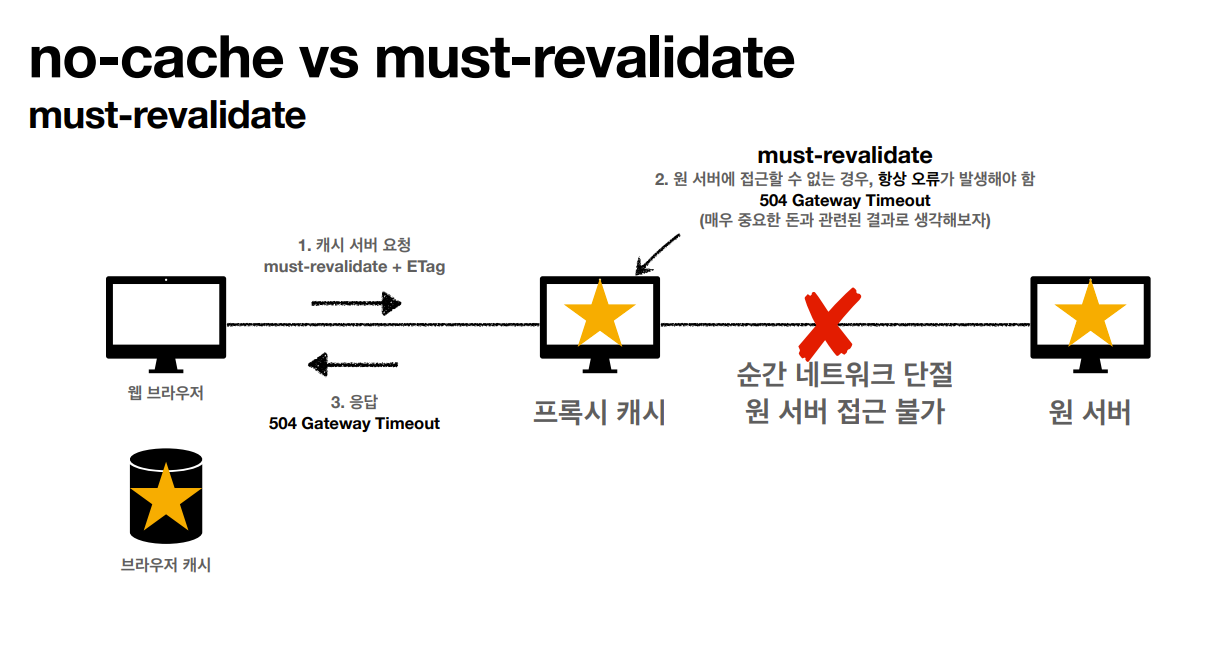 no-cache를 사용하면 원 서버에 접근할 수 없는 경우 오래된 데이터라도 보여주지만, must-revalidate를 사용하면 원 서버에 접근할 수 없을 때 항상 오류를 뱉는다.