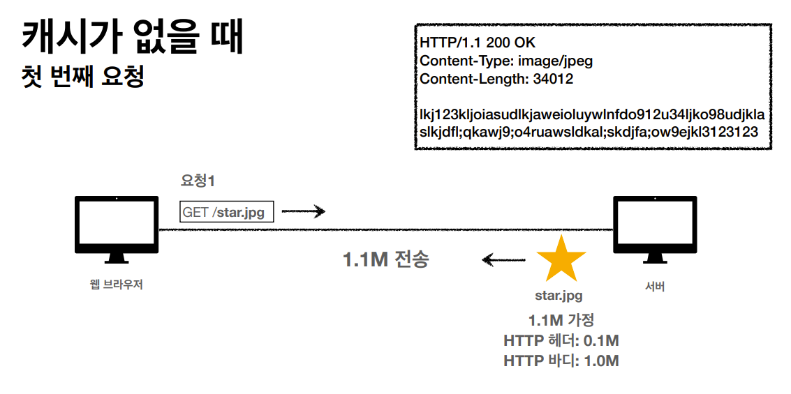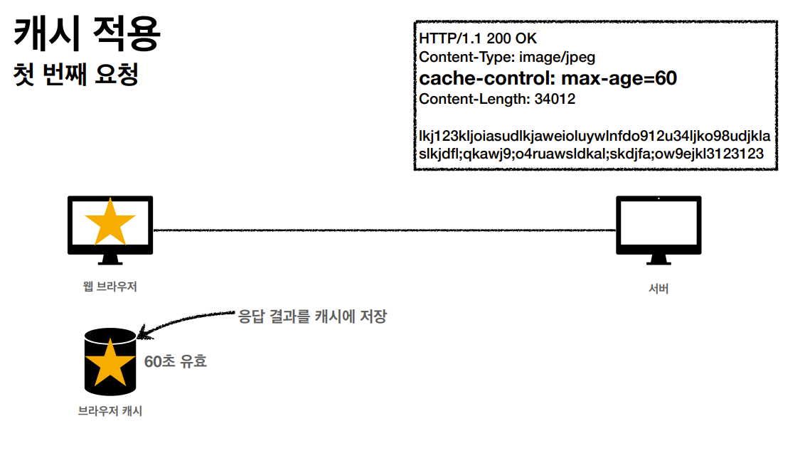 응답 메세지에 캐시가 유효한 시간을 추가해서 보내고, 웹 브라우저는 유효한 시간동안 캐시를 저장해 두 번째 요청 시 캐시 저장소를 찾아 해당 캐시가 있다면 그대로 사용한다.