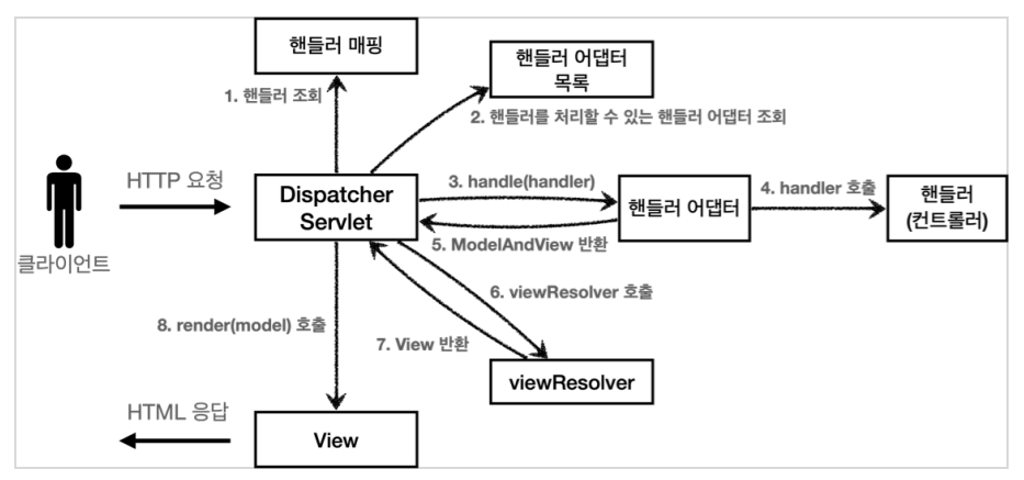3. 핸들러 어댑터 실행 : 핸들러 어댑터가 실제 핸들러를 찾아서 실행한다.
