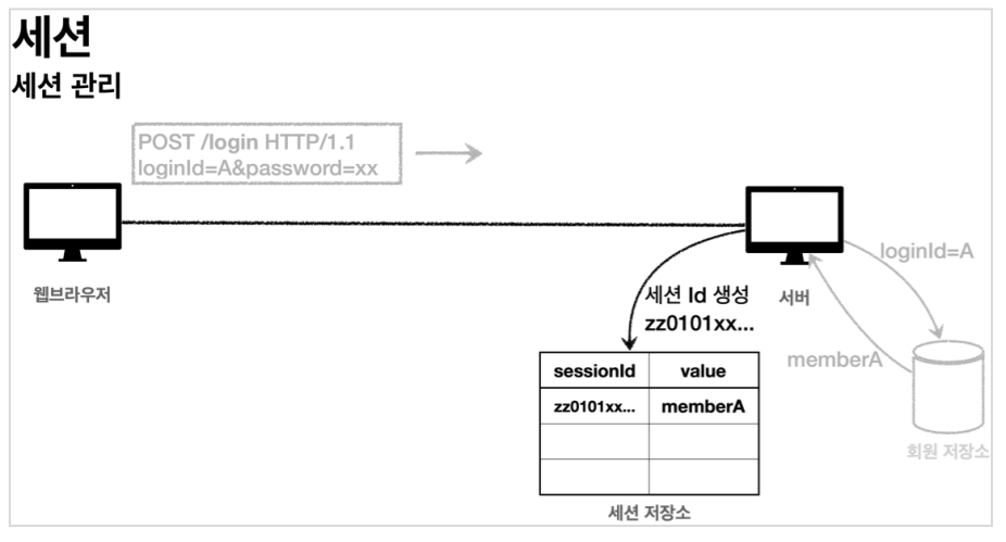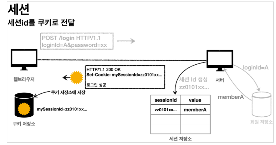 즉, 클라이언트와 서버는 쿠키로 연결되고 서버 내부의 세션에서 세션 아이디를 통해 회원을 조회할 수 있다.