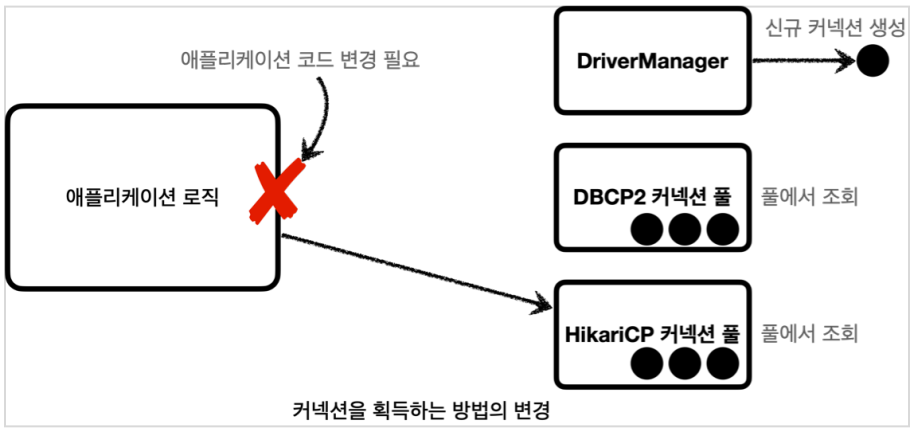 그런데 원래는 드라이버를 통해서 직접 커넥션을 얻어왔었는데, 커넥션 풀을 통해 커넥션을 얻는 방법으로 교체하면 의존관계가 변경되기 때문에 커넥션을 획득하는 애플리케이션 코드도 함께 수정해야 한다.