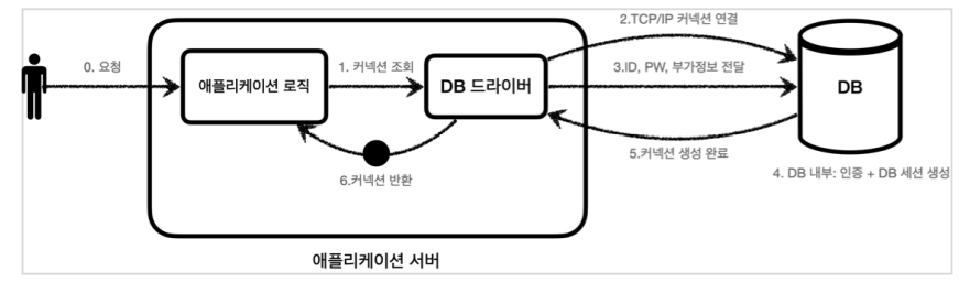 이제 애플리케이션 로직에서 데이터베이스 드라이버를 통해 새로운 커넥션을 획득하는 대신, 커넥션 풀에 있는 미리 생성된 커넥션들을 객체 참조로 가져다가 사용하면 된다. (커넥션 풀의 커넥션들도 내부적으로 드라이버를 사용한다)