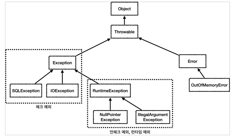 예외도 객체로 분류되기 때문에 다른 객체들과 마찬가지로 최상위 부모는 Object이다.