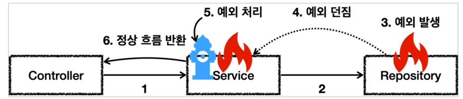 Service는 예외를 잡을 수 있다. 예외를 잡으면 애플리케이션 로직이 정상적으로 돌아온다.