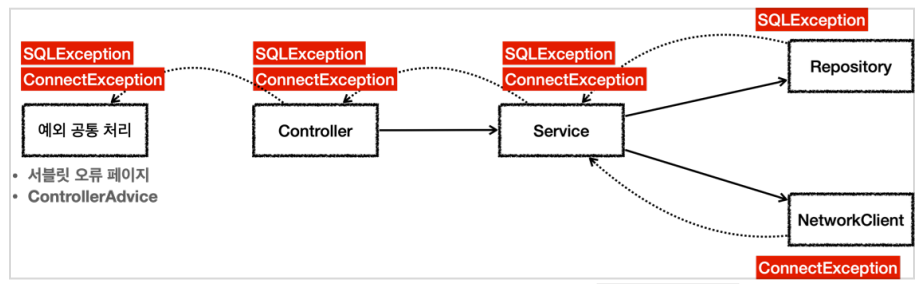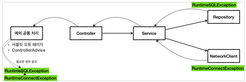SQLException, ConnectException을 런타임 예외로 바꿔서 사용해 서비스와 컨트롤러는 해당 예외를 처리할 수 없을 때 별도의 선언 없이 그대로 두고, 예외를 공통으로 처리하는 ControllerAdvice에서 예외를 처리한다.