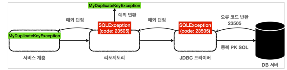 그러니 리포지토리에서 오류 코드를 확인하고 복구 가능한 예외이면 예외를 변환해서 던지는 방식을 사용한다.