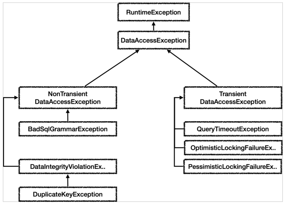 Transient : 해당 예외와 자손은 동일한 SQL을 실행했을 때 성공할 가능성이 있는 예외이다. (쿼리 타임아웃, 락)