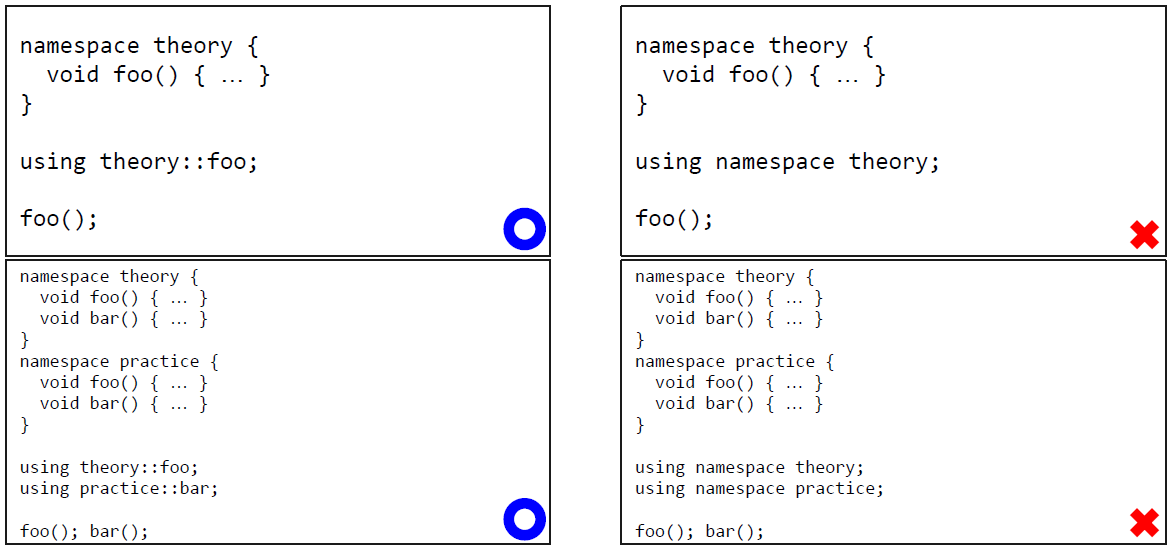 using namespace a; 대신 using a::(사용하려는 멤버) 이렇게 사용하는 편이 합리적이다. (중복을 피하기 위함)
