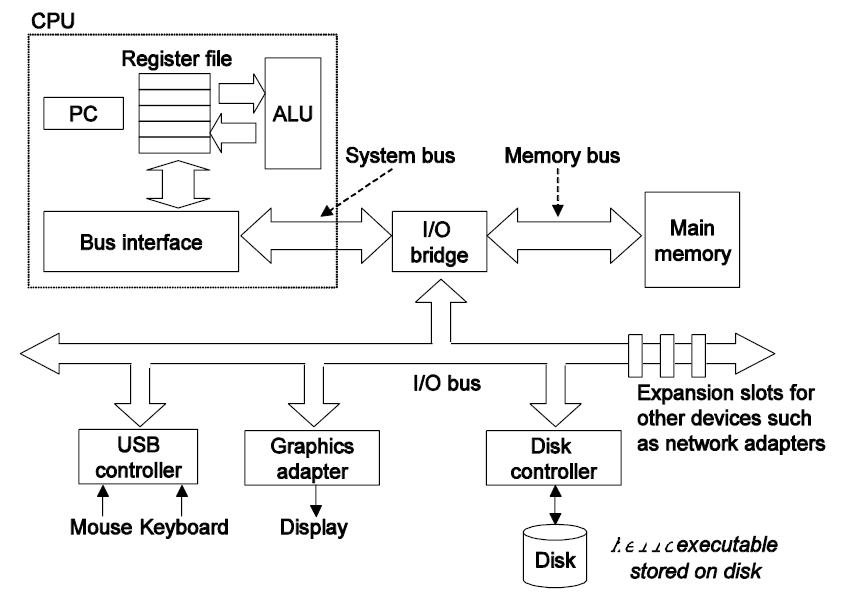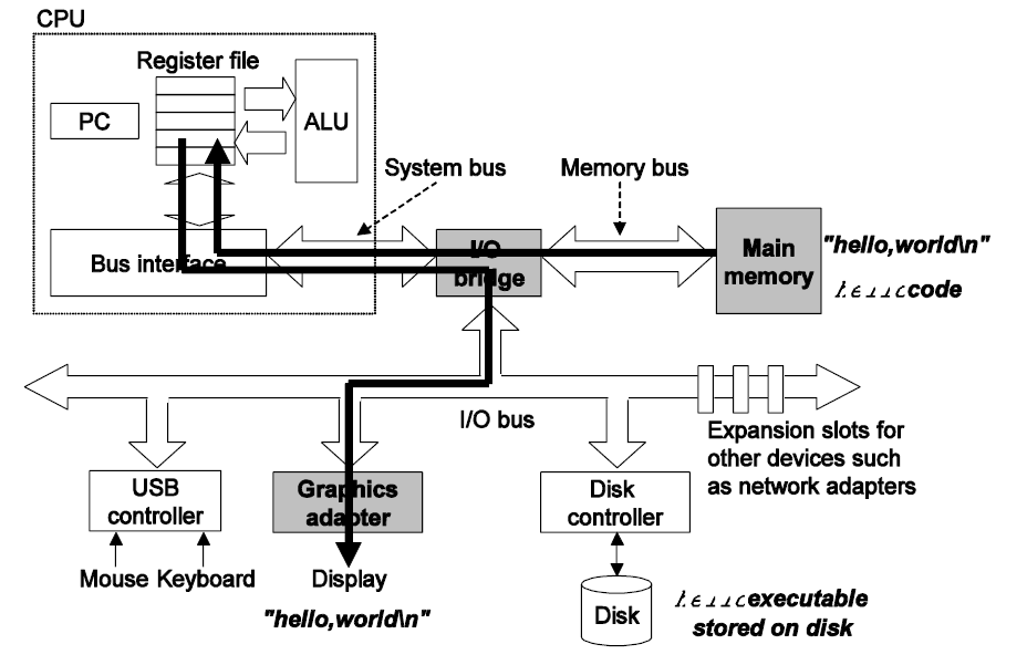 사용자가 키보드를 통해 ./hello 명령어를 입력하면, I/O bus를 통해 명령어가 전달되고, I/O bridge를 경유해 CPU에 도착한다.
