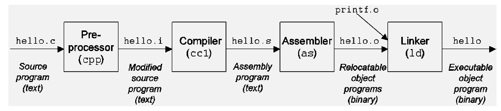 전처리기가 #include #define 등을 처리해 코드에 넣어주고 수정된 텍스트파일인 hello.i 를 만들어낸다.
