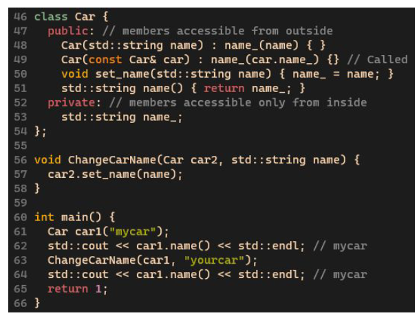 Car(const Car& car) : name_(car.name_) {} // Shallow Copy