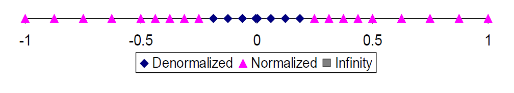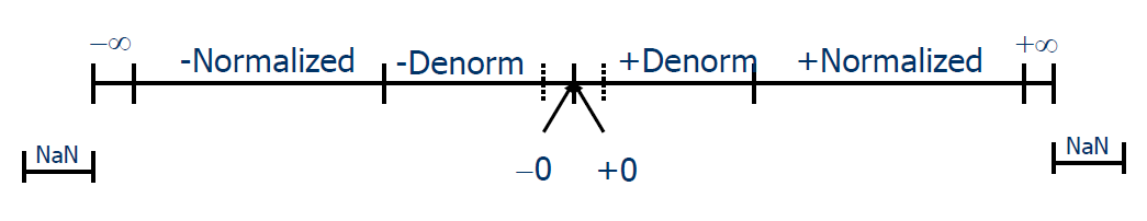 0 근처에는 비정규화 값들이 위치하고, 수직선의 양 끝 부분에는 특수 값이 위치한다.