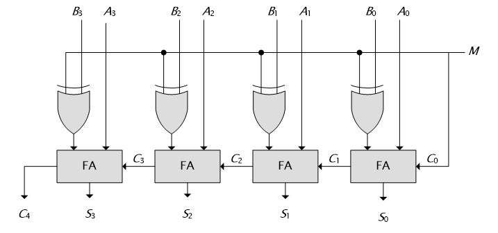 M이 0이면 가산기로, M이 1이면 감산기로 작동한다.