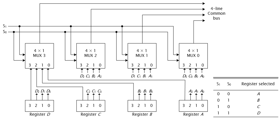 버스는 네 개의 데이터 입력과 두 개의 선택 입력을 가지는 멀티플렉서들로 구성돼있다.