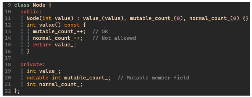int value() const { } 메서드는 원래 멤버변수를 바꿀 수 없지만, mutable 예약어가 붙은 멤버변수는 바꿀 수 있다.