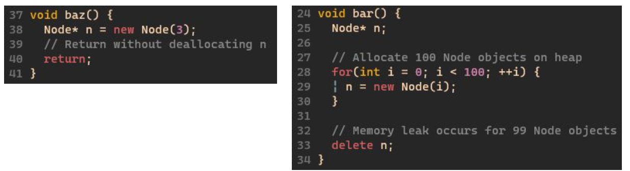 Dangling Pointer는 힙 메모리를 가리키는 포인터는 있지만, 가리키는 대상인 메모리가 없는 문제였고 Memory Leak은 힙 메모리는 있지만 해당 메모리를 가리키는 포인터가 없는 문제이다.