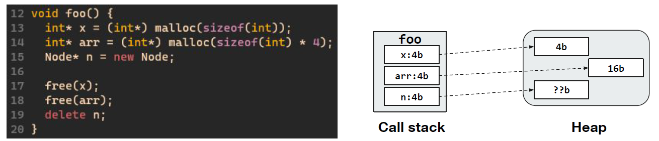 C에서의 malloc 혹은 C++에서의 new 연산자를 사용해 메모리를 할당하면 해당 메모리는 스택 메모리 대신 힙 메모리에 할당된다.