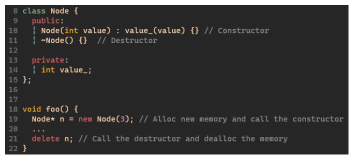 소멸자는 ~Node() {} 처럼 클래스 이름에 ~를 붙여서 선언한다.