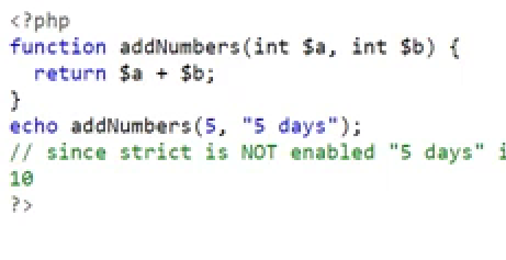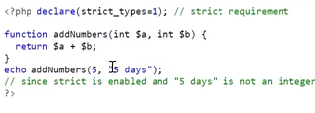delcare(strict_types=1) 로 정의하면 오류를 뱉는다. (타입에 좀 더 엄격해진다)