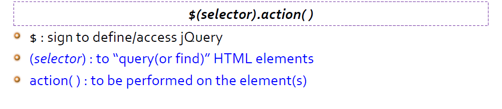 selector 로 적용할 대상을 정하고, action() 으로 어떤 작업을 수행할 지 정한다.