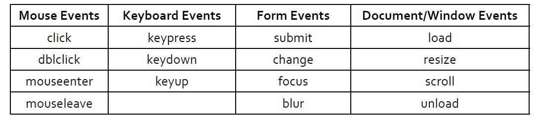 제이쿼리에서 사용하는 이벤트들은 자바스크립트에서 사용하는 이벤트와 겹치는 부분이 많다.