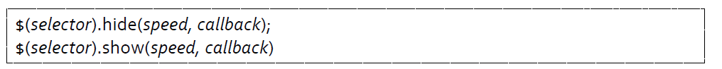 인자 speed 로 숨기거나 보여주는 작업의 속도를 지정할 수 있다. (fast slow 혹은 milisecond 단위로 지정함)
