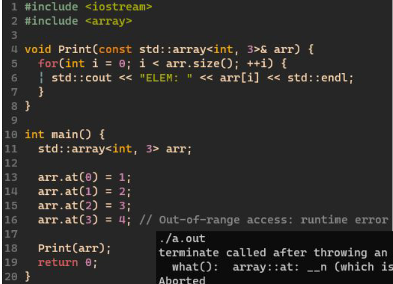 왼쪽과 같이 Random Access 방식으로 요소에 접근 할 때는 오류를 뱉지 않지만, 오른쪽과 같이 array STL을 사용해서 요소에 접근 시 오류를 뱉는다.