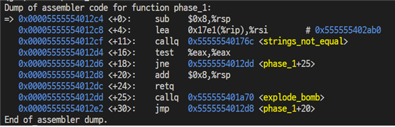 gdb bomb 명령어로 디버깅 모드에 진입한 후 disas phase_1 명령어로 phase_1 함수가 어셈블리어로 어떻게 작성된 지 확인해봤다.