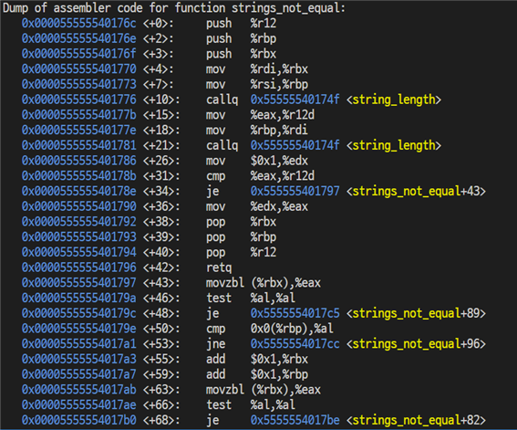 disas strings_not_equal 명령어로 strings_not_equal 함수를 어셈블리어로 살펴보고 있다.